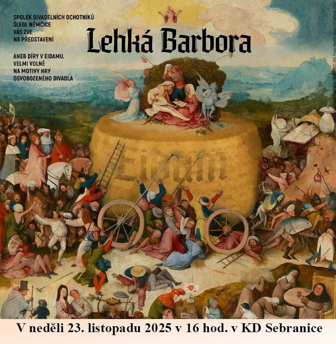 Srdečně Vás zveme na divadelní představení Lehká Barbora, aneb díry v Eidamu. Velmi volně na motivy hry Osvobozeného divadla. Představení sehraje spolek divadelních ochotníků Šlegl Němčice.