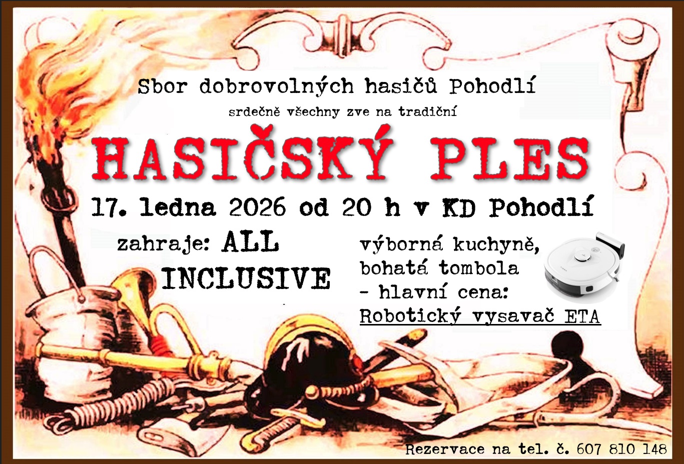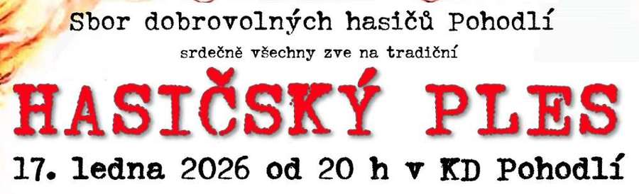 Sbor dobrovolných hasičů Pohodlí Vás srdečně zve na tradiční HASIČSKÝ PLES, který se bude konat v sobotu 17. ledna 2025 od 20 hodin v KD Pohodlí.