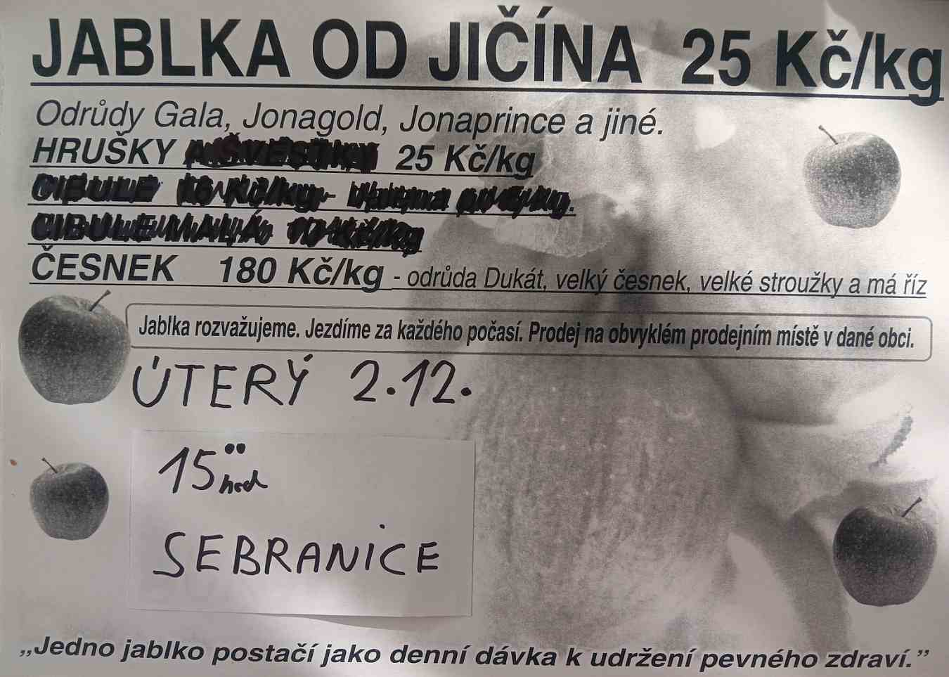 Prodej jablek od Jičína, odrůdy: Gala, Jonagold, Jonaprince, a hrušky: 25 Kč/kg. Česnek: 180 Kč/kg - odrůda Dukát, velký česnek, velké stroužky a má říz.
