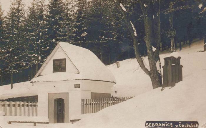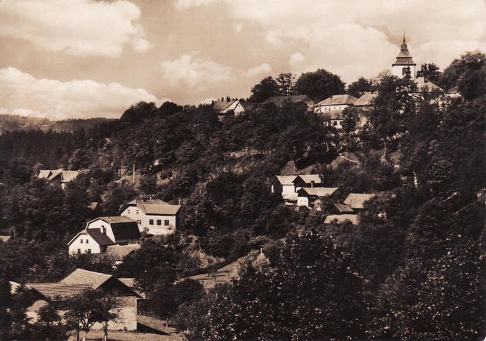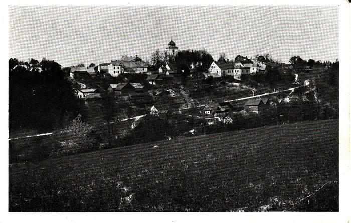 Pohled na střed obce, kde můžete vidět Kapli Nejsvětější Trojice, bývalou hospodu a další stavení. Pohlednice byla zaslána v r. 1935, rok jejího vzniku však není znám.