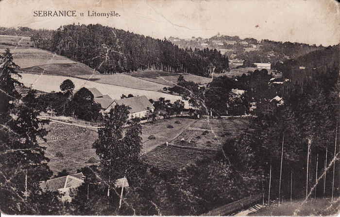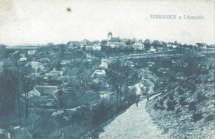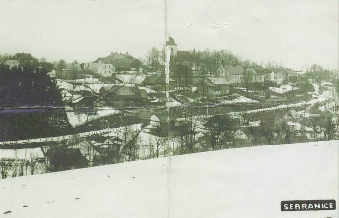 Pohled na Sebranice směrem od Lubné. Na pohlednici můžete vidět obecní úřad, školu, faru a věž kostela. Pohlednice byla zaslána v r. 1935, rok jejího vzniku však není znám.