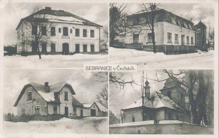 Sebranice, rok 1934, vlevo nahoře budova školy, vpravo nahoře kampelička (nyní pošta), vlevo dole dům čp. 24, vpravo dole kostel se starou věží, nakladatel Arnošt Zlámal, obchod koloniální a se železem, foto R. Šplíchal, Nové Hrady.