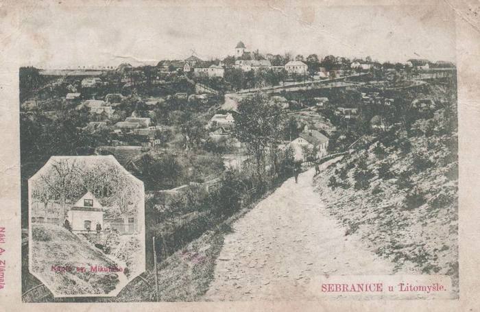 Pohled na část Sebranic z Pohory, rok 1908, pohlednice vydána nákladem A. Zlámala.