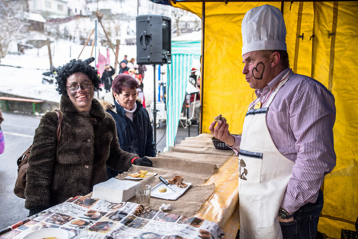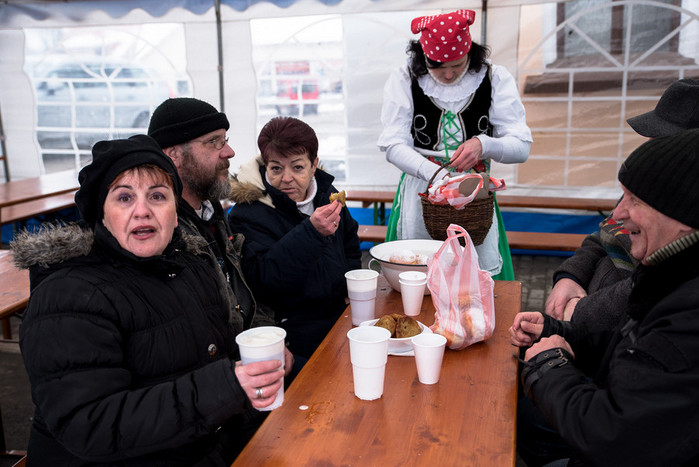 Tak, aby vše klapalo ke spokojenosti návštěvníků. Novinkou letošních hodů byl stánek Agro družstva, u kterého jste mohli ochutnat nejrůznější pochoutky vyrobené z brambor. Skvělý nápad! Zatímco lidé stáli u moštárny frontu na oběd, u hasičárny se začaly scházet masky a připravovat se na odpolední průvod. Ve 13 hodin po společném fotografování se masky vydaly dolů ke kapličce, aby přinesly zábavu a smích všem, kteří na ně již netrpělivě čekali.