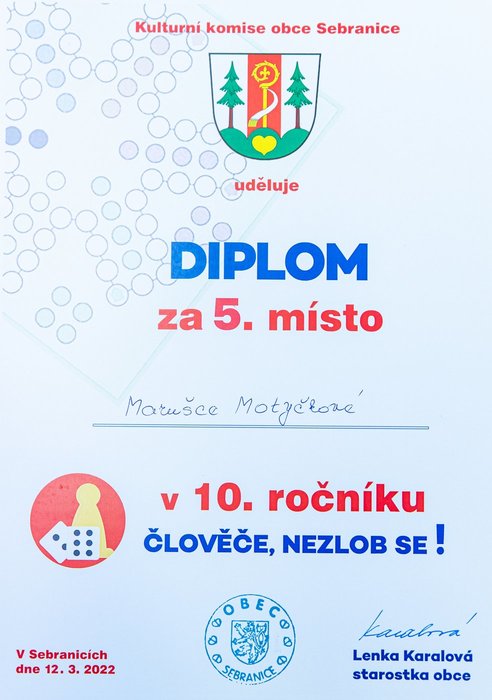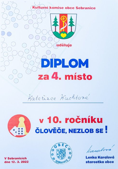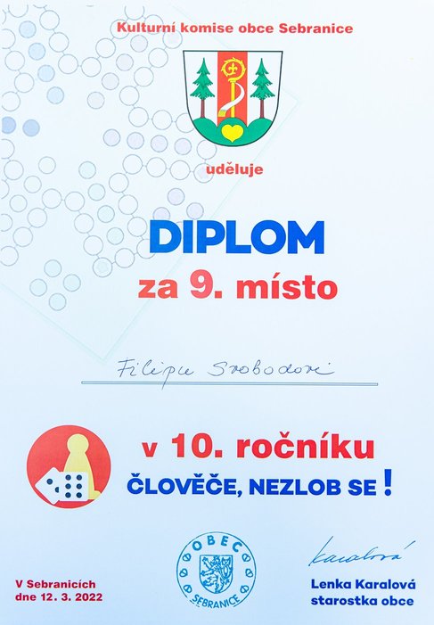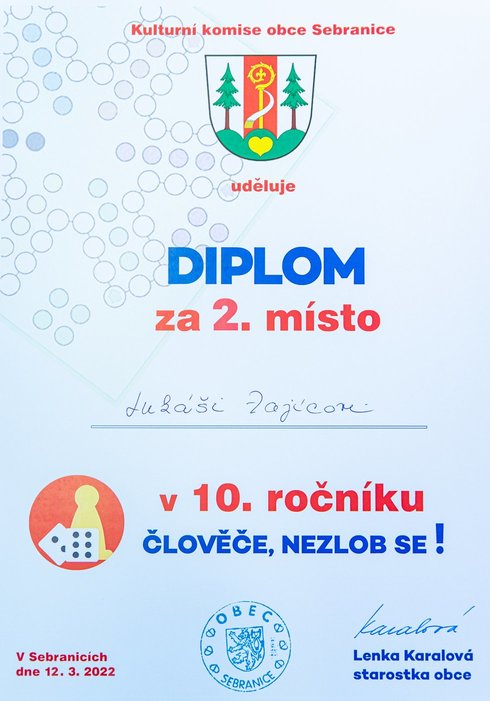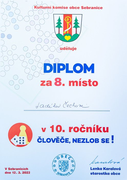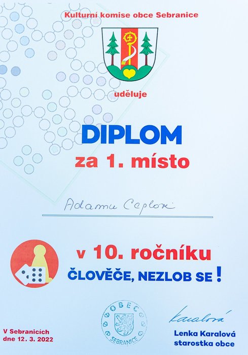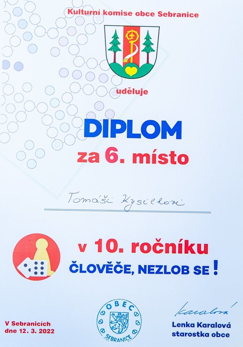 Turnaj odloženého 10. ročníku ve stolní hře „Člověče, nezlob se !“ se uskutečnil v sobotu 12. 03. 2022 na sále KD v Sebranicích. Cestu ke hravému odpoledni si našlo cca 30 účastníků, z nichž odvahu zahrát si turnaj nalezlo 16 z nich. Ostatní byli buď v roli dobrovolníků – např. v dohledu nad hrou (Lucie a Ilona Vítovy, Zuzana Lipavská, Denisa Čechová a Gabriela Vostřelová) nebo doprovodili mladšího sourozence a nebo si jen tak přišli užít hravé odpoledne u doprovodného programu (prostor nabízel možnost házet si baketalovým míčem na dva koše, zahrát si ping pong, vybarvovat si omalovánky, trávit čas u různých skládaček, apod.).