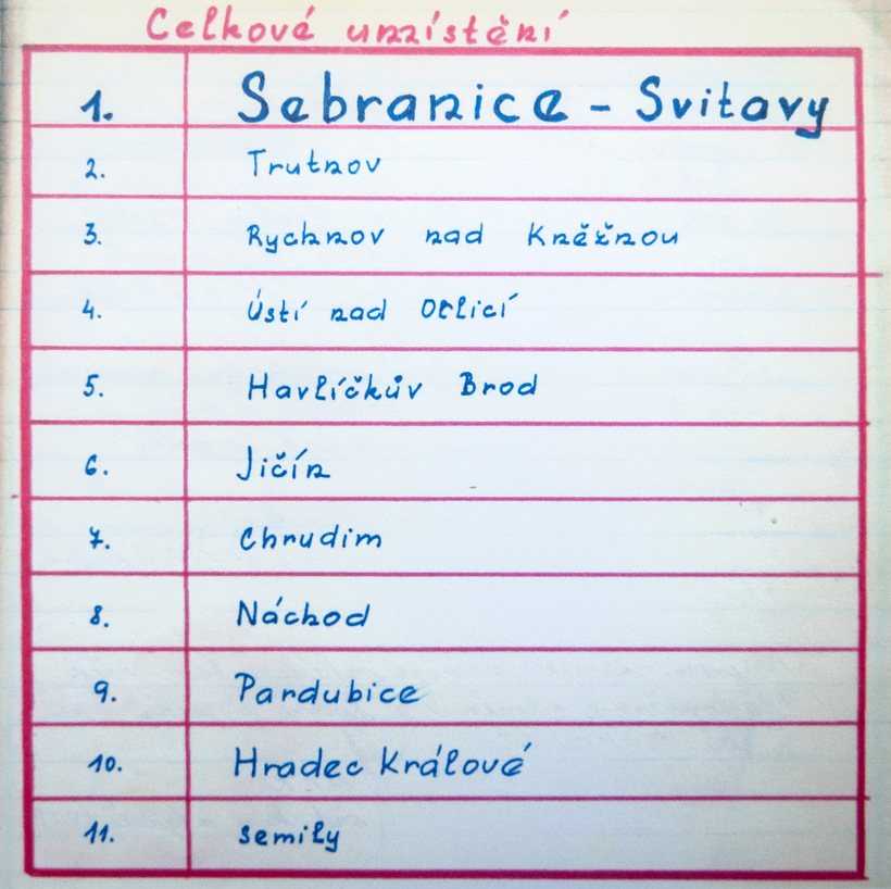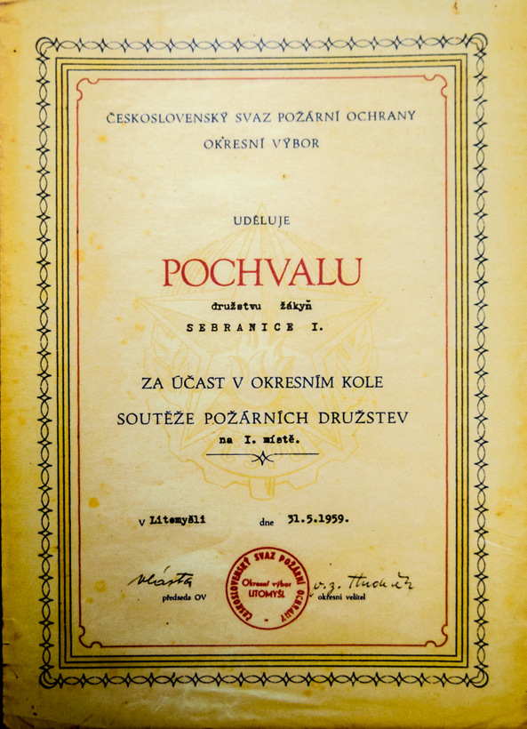 Okresní kolo soutěže v Litomyšli 31. Května 1959. Družstvo žáků ze Sebranic se umístilo na I. místě v dané kategorii.