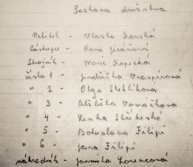 Zadní řada zleva: Jaroslava Šimková, Anna Motyčková, Marie Sýkorová, Emilie Tmějová, Marie Kárská.