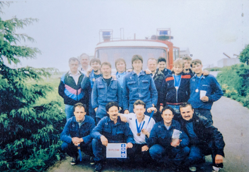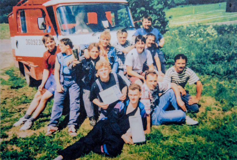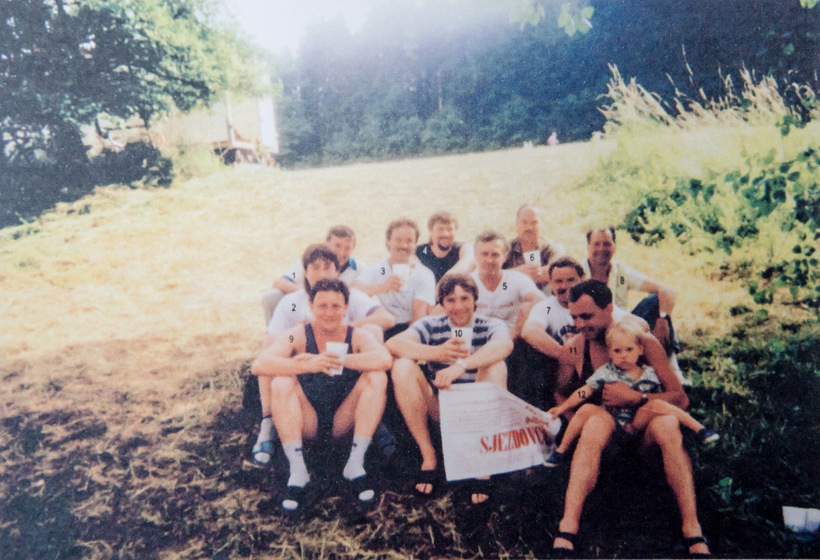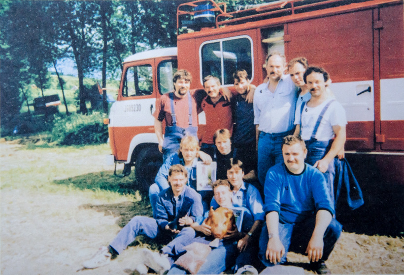 Snímek družstva mužů SDH Sebranice na soutěži v Přívratu v roce 1994